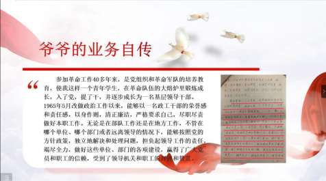 她谈到爷爷奶奶对自己的言传身教, “我从未听爷爷奶奶抱怨过以前付出的辛苦和汗水,也从未听他们炫耀过以前获得的荣誉和成就;他们只是反复地用言传和身教告诫我:做人一定要谦虚谨慎,做事一定要认真负责。‘一定要入党,一切跟党走’是他们最爱对我说的话。”这便是爷爷奶奶作为优秀共产党员,在漫漫岁月长河和历史变迁中总结出来的最朴素的准则和最殷切的期盼。“他们永远是我最好的榜样,我也会永远朝着他们心中所期待的模样努力成长。”老一辈优秀共产党员在点滴言传身教中为后辈带来的精神滋养,值得每一位青年人不断传承与延续。