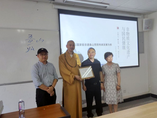 梵呗有五种功德利益,即五种清净相,所谓正直、和雅、清彻、深满、周遍远闻。经云:“如听梵呗,其利有五:一者身体不疲,二者不忘所忆,三者心不懈怠,四者音声不坏,五者诸天欢喜。”为帮助同学们更好地理解鱼山梵呗“声曲折,音瑞响”“息曲折,气自华”“路曲折,道通达”的文化特质和实践路径,传承人释永悟在现场展示了梵呗“三曲折”气息特征与应用效果,以“身心力爱,智慧疗愈”视角切入主题,详细阐释了梵呗与禅拳道功夫的核心概念,积极倡导以“身心强大,活在当下”等理念,探索、践行、文旅、研学相互融合,发挥非物质文化遗产对国民健康的多元价值与功能。