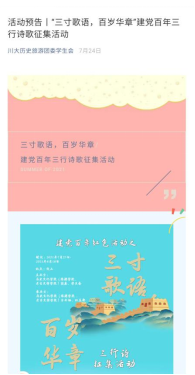 本次活动采取线上征集的方式,以“中国共产党建党一百周年"为主题面向全校学生征集优秀三行诗作品,鼓励同学们以笔墨抒怀、以歌诗咏志,共祝党的百岁华诞、共数党的一路风雨,共赞先驱前辈的精神光耀、共期党和祖国的绚烂前途。活动自开始之日便受到同学们的广泛关注,截至8月10日,一共收到了19篇优质原创稿件。
