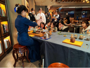 第三组同学在王俊鸿老师、邹卫老师、王晓辉老师的带领下来到了有“西藏的窗口”之称的成都西藏饭店。成都西藏饭店不仅是国家五星级旅游饭店、国家金叶级绿色旅游饭店,还是全国首家“金鼎级”藏文化主题酒店,其“藏文化主题特色的创新发展之路”不仅让饭店自身得到了转型发展,更让神秘的藏文化借助旅游饭店的载体为全球宾客熟知。学习西藏饭店在主题化、特色化、精品化道路上的探索过程和丰富经验可以帮助同学们更加深入地理解“文旅融合”的发展理念和传统饭店企业的产品创新途径。到达西藏饭店之后,同学们分成4组,在酒店管理人员的带领下参观考察酒店内部的各个功能区。从富有西藏风情的酒店大堂,到蜜蜡黄主题楼层留影打卡地,再到将藏族文化融入空间设计的客房,同学们看到了藏族文化融入饭店经营的各种途径和方式。在藏族文化长廊,现场工作人员给同学们耐心讲解了藏族特色非遗工艺品的文化内涵和制作工艺,使同学们对藏族文化有了更加全面的了解。在甲拉书院,同学们观赏了饭店茶艺师的茶艺表演,亲自体验了藏茶艺术的魅力。此次参观活动让同学们深刻体会到民族文化所蕴含的最深沉和最能打动人心的力量。