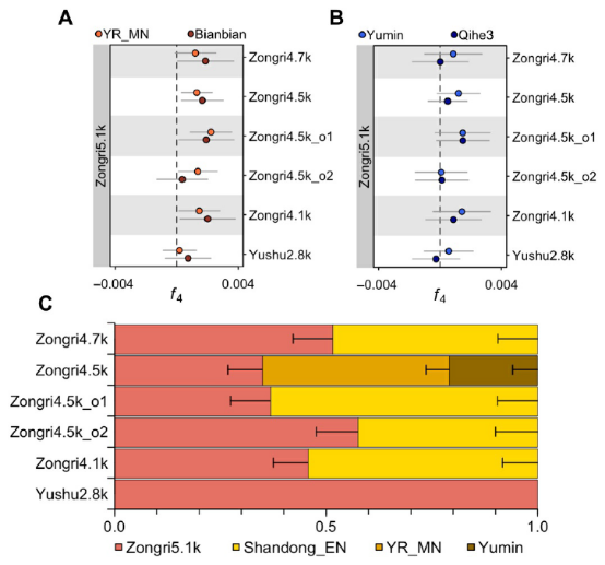 图3:不同时间青藏高原东北部人群F4及qpAdm结果。