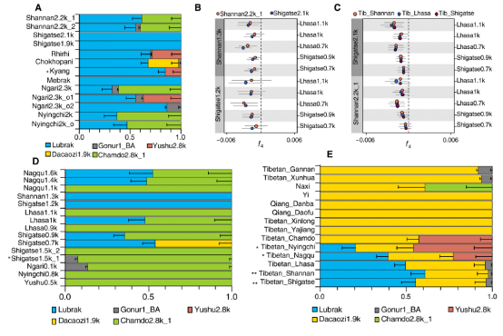 图1:(A-B)研究涉及青藏高原古人群的时间及地理分布。(C)ADMIXTURE分析。(D-F)主成分分析。注:图C中主要颜色对应的成分,蓝色,青藏高原成分;红色,东亚南部成分;粉红色,古代西伯利亚北部成分;黄色/灰色,中亚成分。