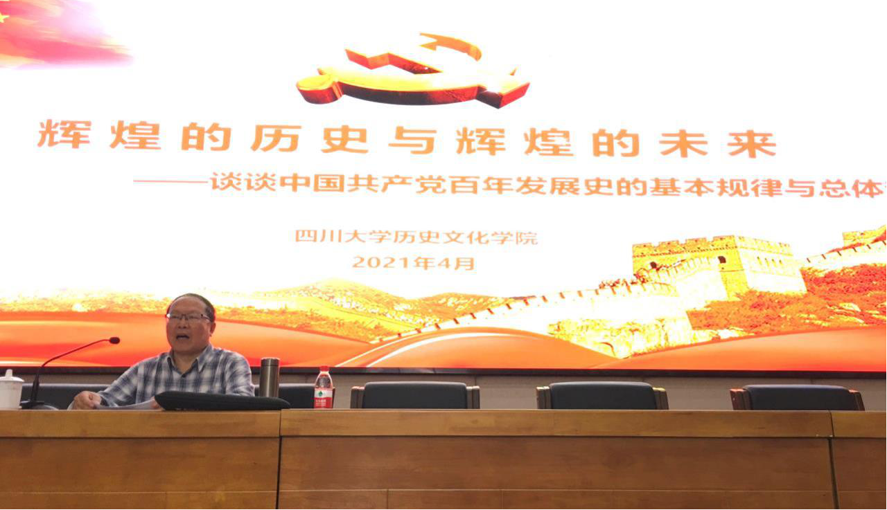 首先,陈廷湘教授以毛泽东同志对新中国解放做出的伟大贡献引出主题“辉煌的历史与辉煌的未来一一谈谈中国共产党百年发展史的基本规律与总体趋向”, 概述了百年来中国共产党的光辉奋斗与伟大牺牲,强调“没有共产党就没有新中国”。