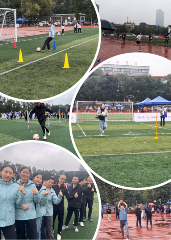在运动会各项活动中,都能看见我院教职工的身影。除了单人项目,在长绳跳绳、绕杆踢球射门、抛球入框、12×60米男女混合迎面接力等集体项目中,我院教职工团结协作、力争第一,均有出色的表现。