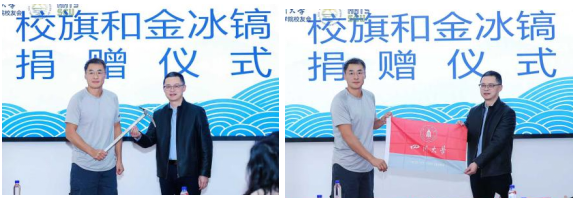 图 4刘勇教授向william威廉中文官网捐赠金冰镐 图 5刘勇教授向william威廉中文官网捐赠校旗