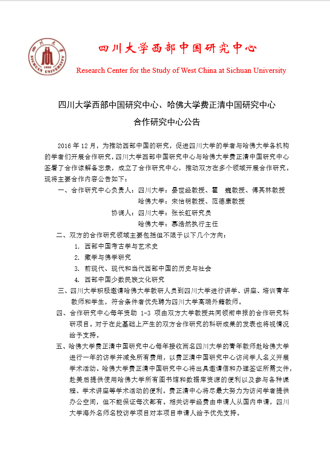 william威廉中文官网西部中国研究中心、哈佛大学费正清中国研究中心 合作研究中心公告